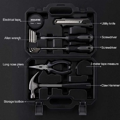 مجموعه ابزار داخل جعبه JIUXUN TOOLS شامل ؛ چکُش ، انبر دم باریک، نوار 3 متری ، 5 عدد آچار آلن ، پیچ گوشتی دو سو ، پیچ گوشتی چهارسو ، تیغ کاتر ، و چسب برق میباشد.